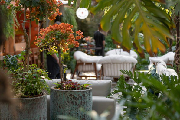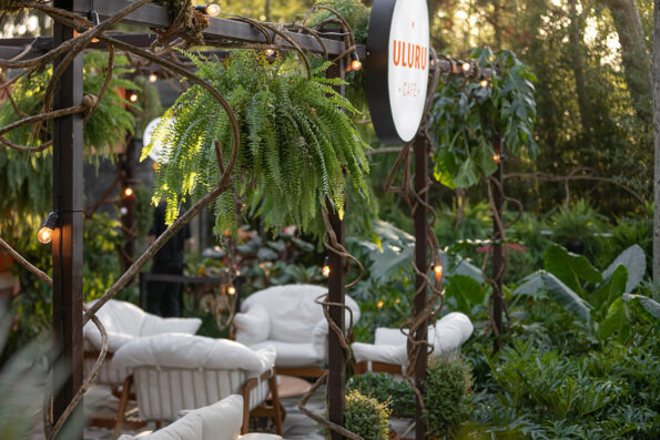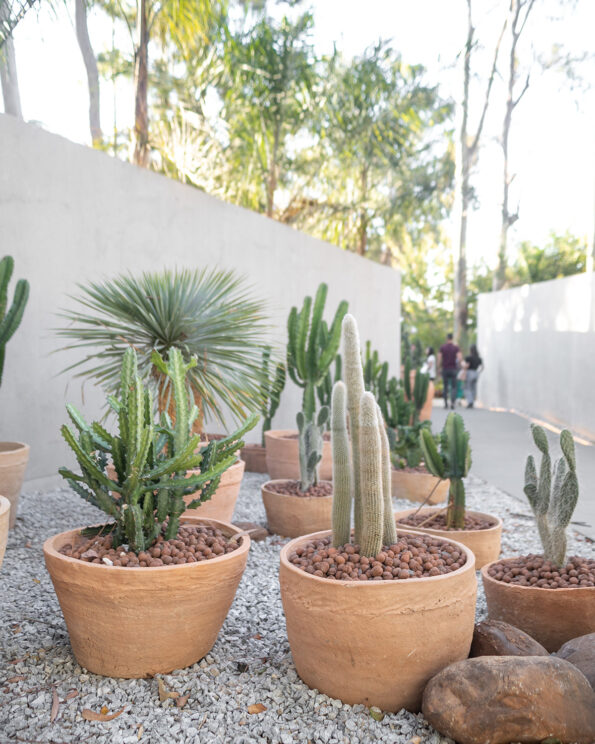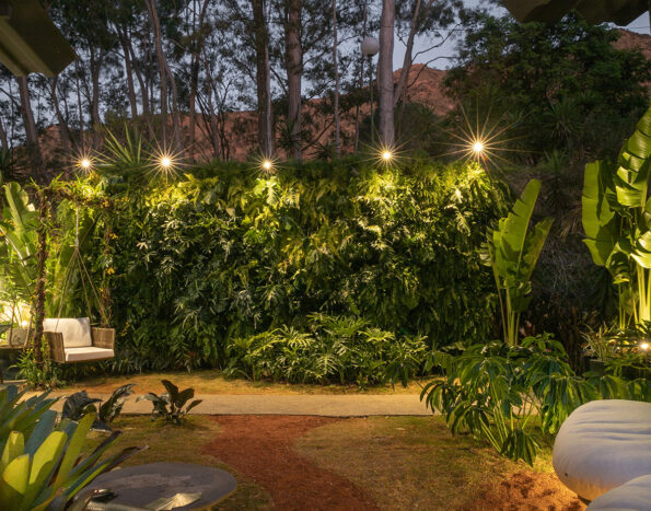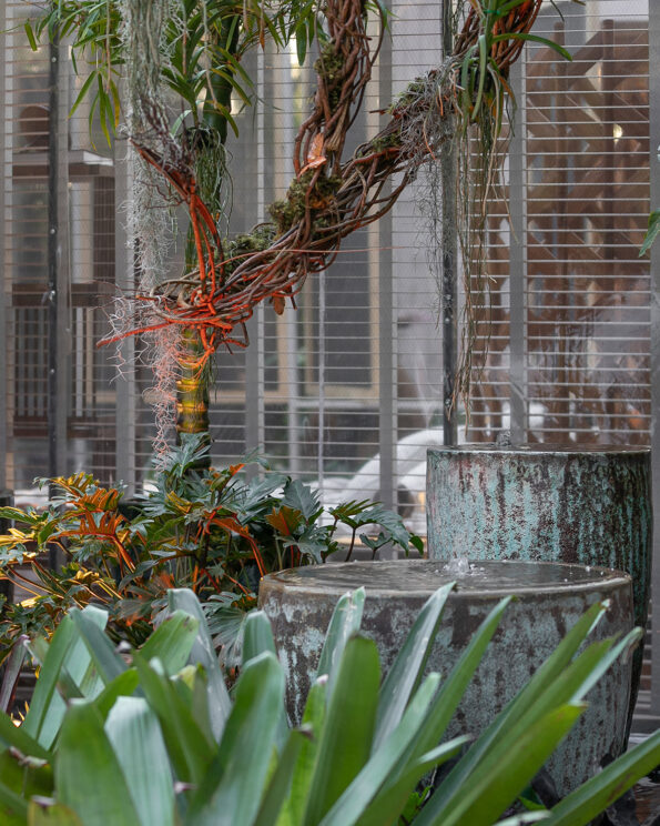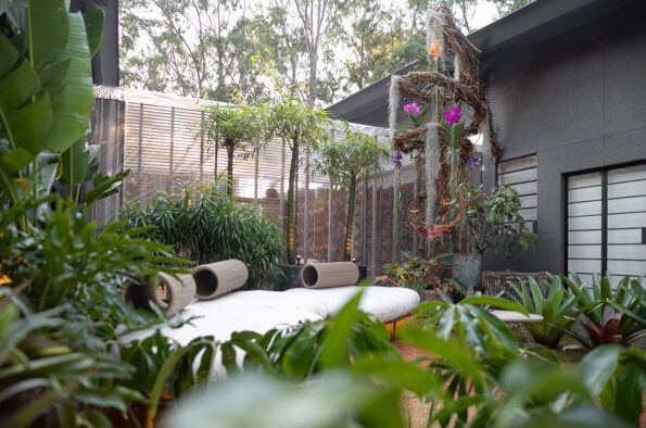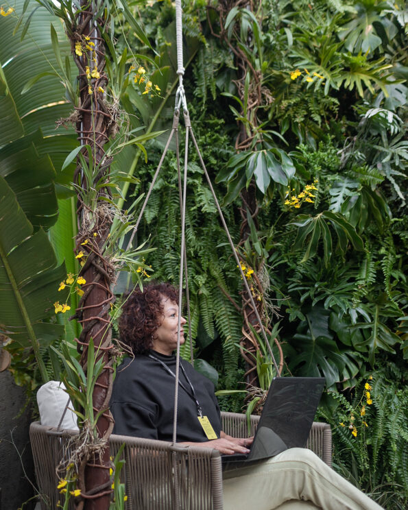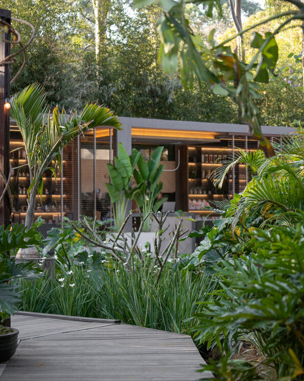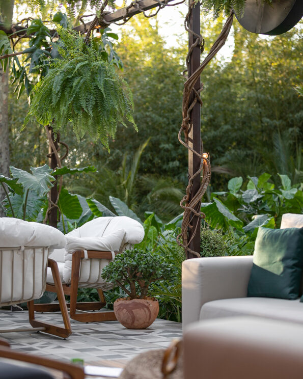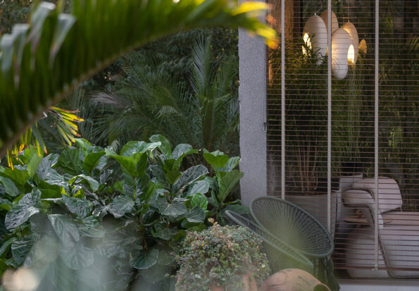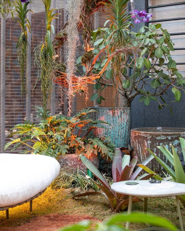A simplicidade de samambaias e plantas tropicais têm contraponto na sofisticação de vasos vietnamitas em um jardim sereno. Na parede de folhas de plantas variadas, a delicadeza do balanço se contrapõe à delicadeza desse jardim vertical tropical, trazendo ainda mais camadas ao jardim. A combinação de plantas de diferentes tons, formatos e texturas com o sofá em formato de seixo rolado, que são pedras encontradas em rios, e o barulho das águas, convida os visitantes a descansar, refletir e se conectar com suas raízes.