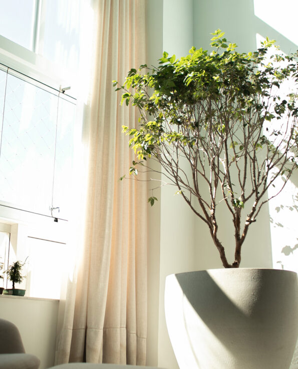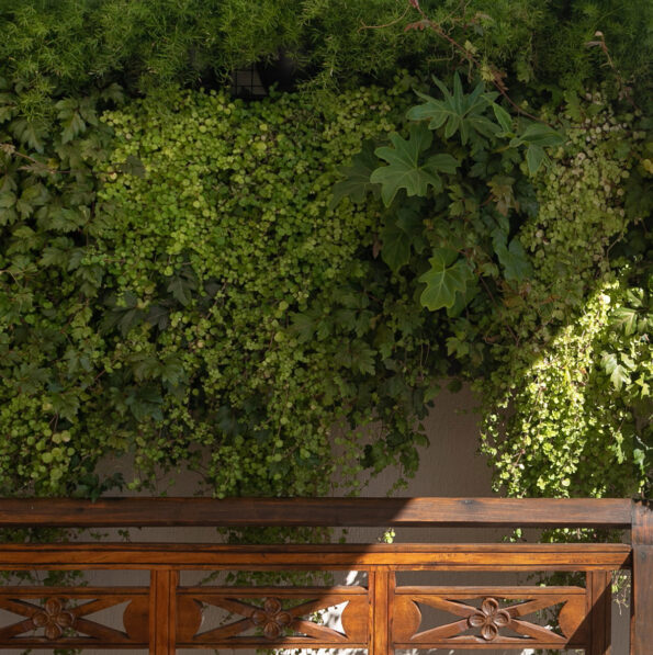 Optamos por um jardim vertical para dar mais frescor ao local devido à constante iluminação. Colocamos plantas era da folha larga, renda francesa, costela de adão X, Y e Z ao longo de uma das paredes, caindo em formato de cascata, trazendo não só cor como textura ao ambiente. Em cima de cada uma das mesas, optamos por um vaso baixo, largo e arredondado, em um tom claro para contrastar com o tom de madeira da mesa. Cada vaso estava recheado de lavandas, que traz um toque de cor ao ambiente e permite que a cliente se sinta ainda mais tranquila após o uso do seu SPA.