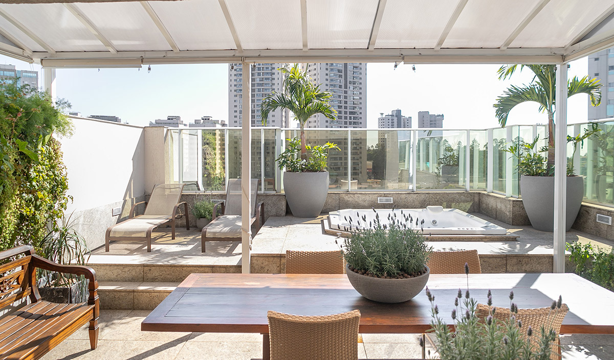 Este foi um projeto especial, pois lidava diretamente com sonhos dos clientes. Fabi sempre quis ter palmeiras e um pé de jabuticaba em sua sala-de-estar, então levamos as plantas da sua memória afetiva, junto com outras plantas tropicais, à cobertura, trazendo à realidade o seu sonho de longa data.