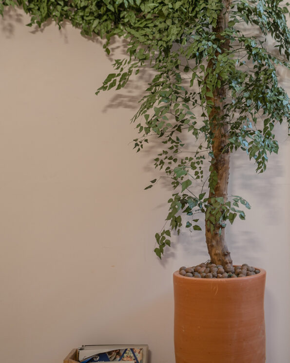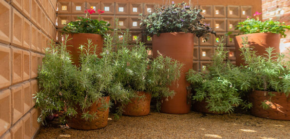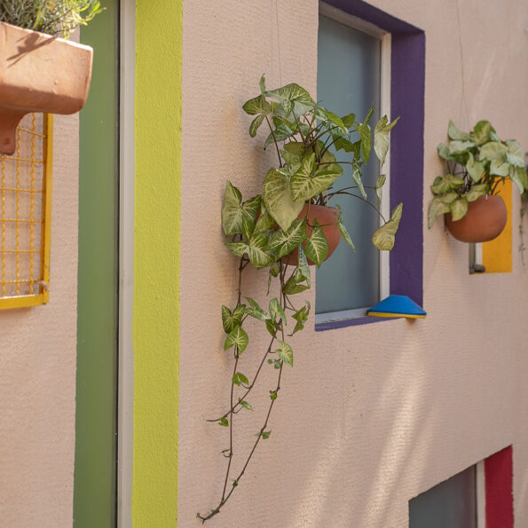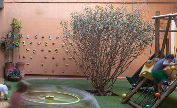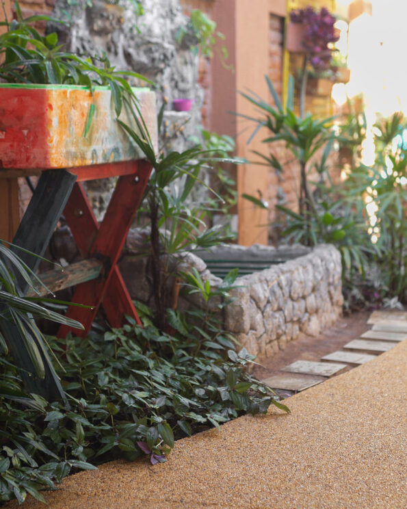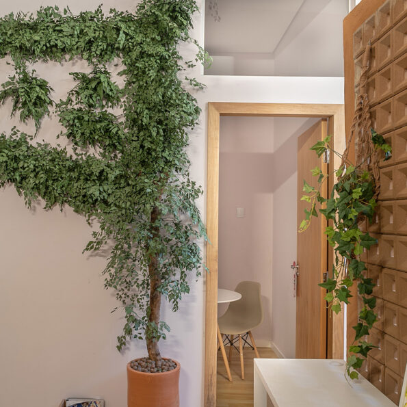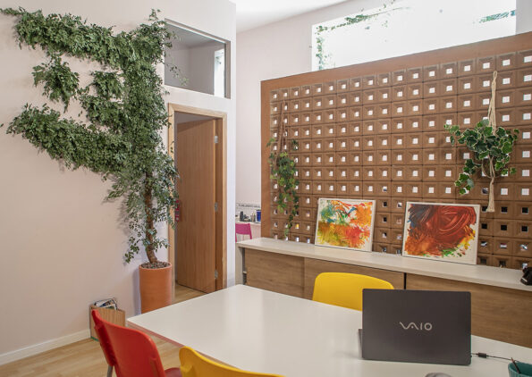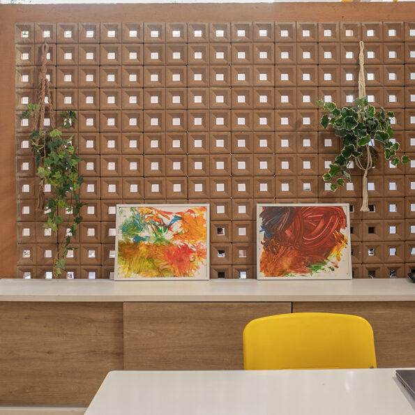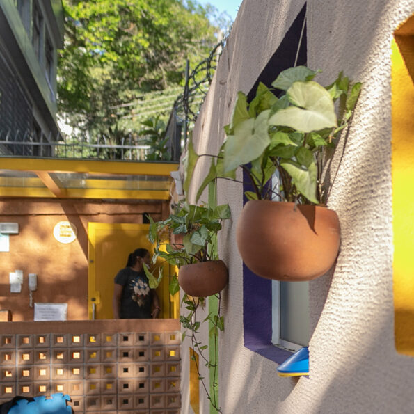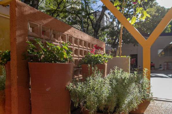 Ainda na parte externa, no corredor de entrada, acrescentamos vasos de barro, que remetem à memória afetiva – tanto das crianças quando dos adultos – e ao artesanato. Inserimos flores de gerânio de corda e ametista, assim como outras plantas com folhas marcantes e cores fortes. A ideia aqui era que as pessoas se sentissem abraçadas e aconchegadas ao entrar nesse espaço onde passam uma grande parte do seu dia, como uma segunda casa.