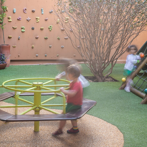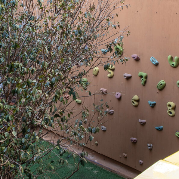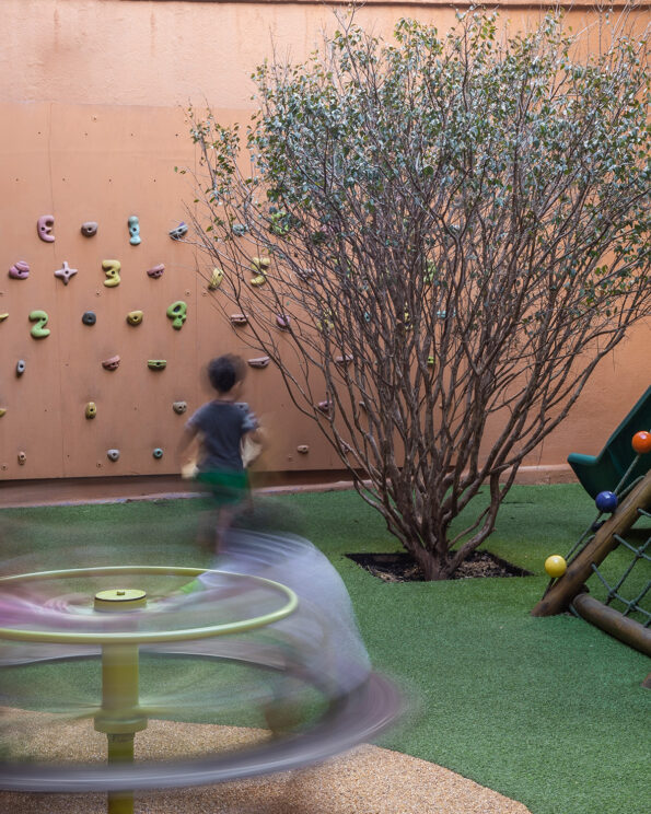 Na parte interna, optamos por vasos suspensos com cordas em tons barrosos com plantas que caem em formato de cascata, como tradescansia planta X e jiboia planta Y. No chão, grandes vasos com plantas altas (como acerolaX e palmeira raphis Y), para que as crianças se sentissem rodeadas pela natureza.