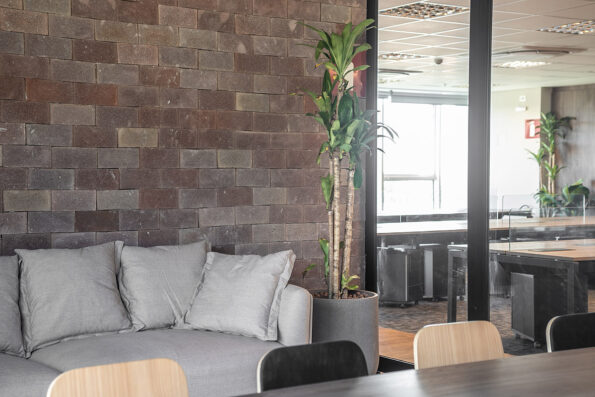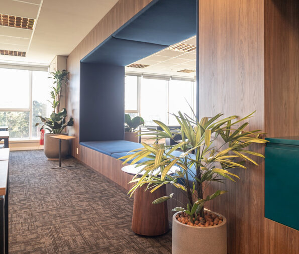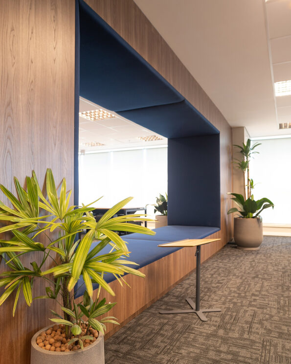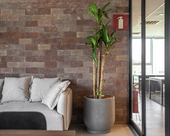 Para a recepção, usamos o pleomele verede , que além de trazer o toque de verde requisitado pelo cliente, acrescenta uma leveza ao ambiente. Nos outros ambientes, optamos sempre por contrastar uma planta alta (como pleomelee imbés variados planta X) com uma planta baixa (pacová, zameoculcas e Imbé amazônico planta Z, planta A) para trazer equilíbrio ao ambiente corporativo.