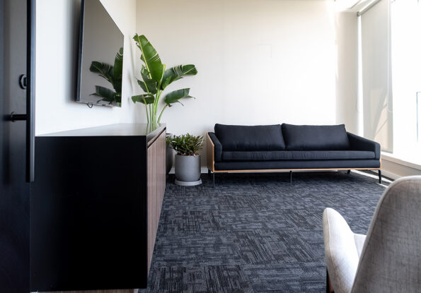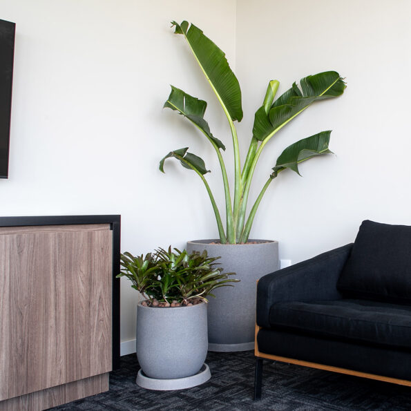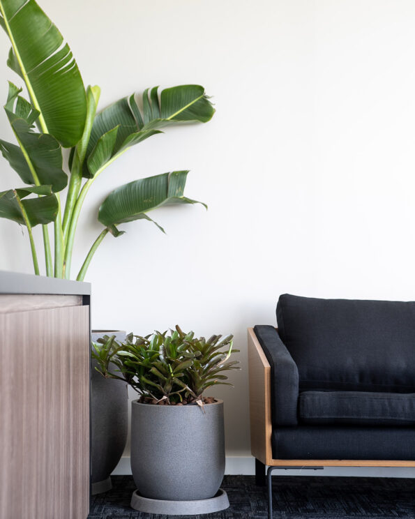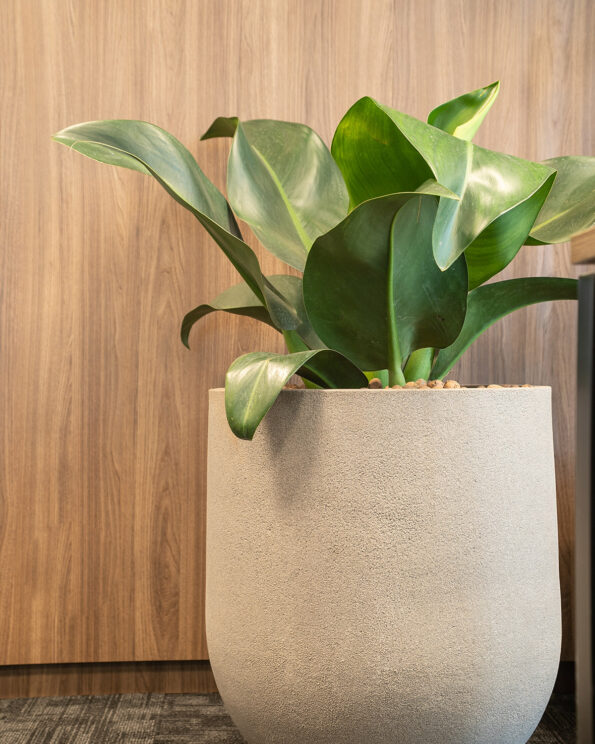 A pedido do cliente, escolhemos plantas de fácil manutenção, de modo que ele pudesse cuidar delas por conta própria. O conceito estabelecido era de acrescentar pequenos toques de verde ao espaço, sem sobrecarregar o ambiente com plantas. Por isso, escolhemos vasos largos e arredondados em tons neutros, com plantas mais discretas.